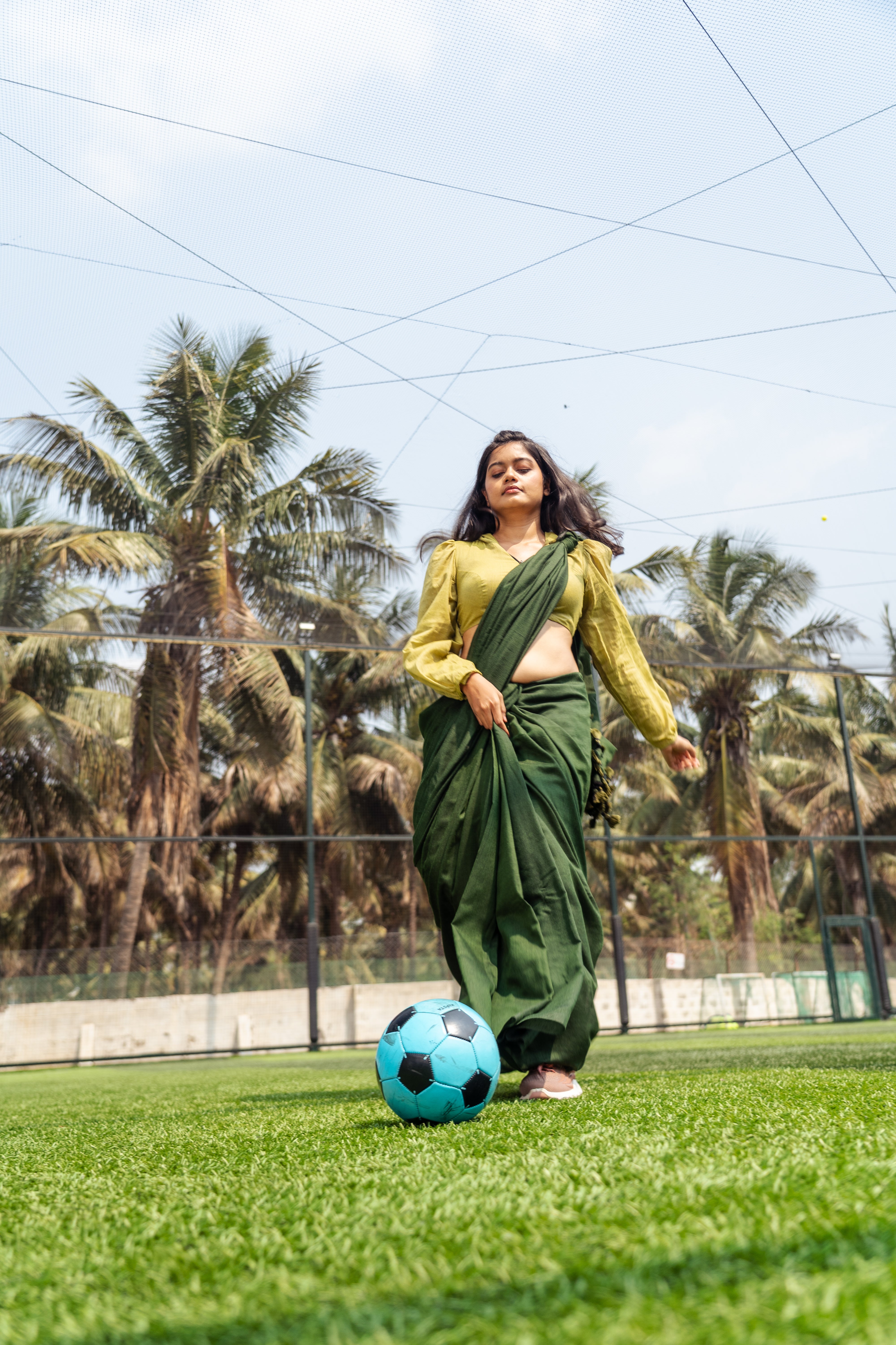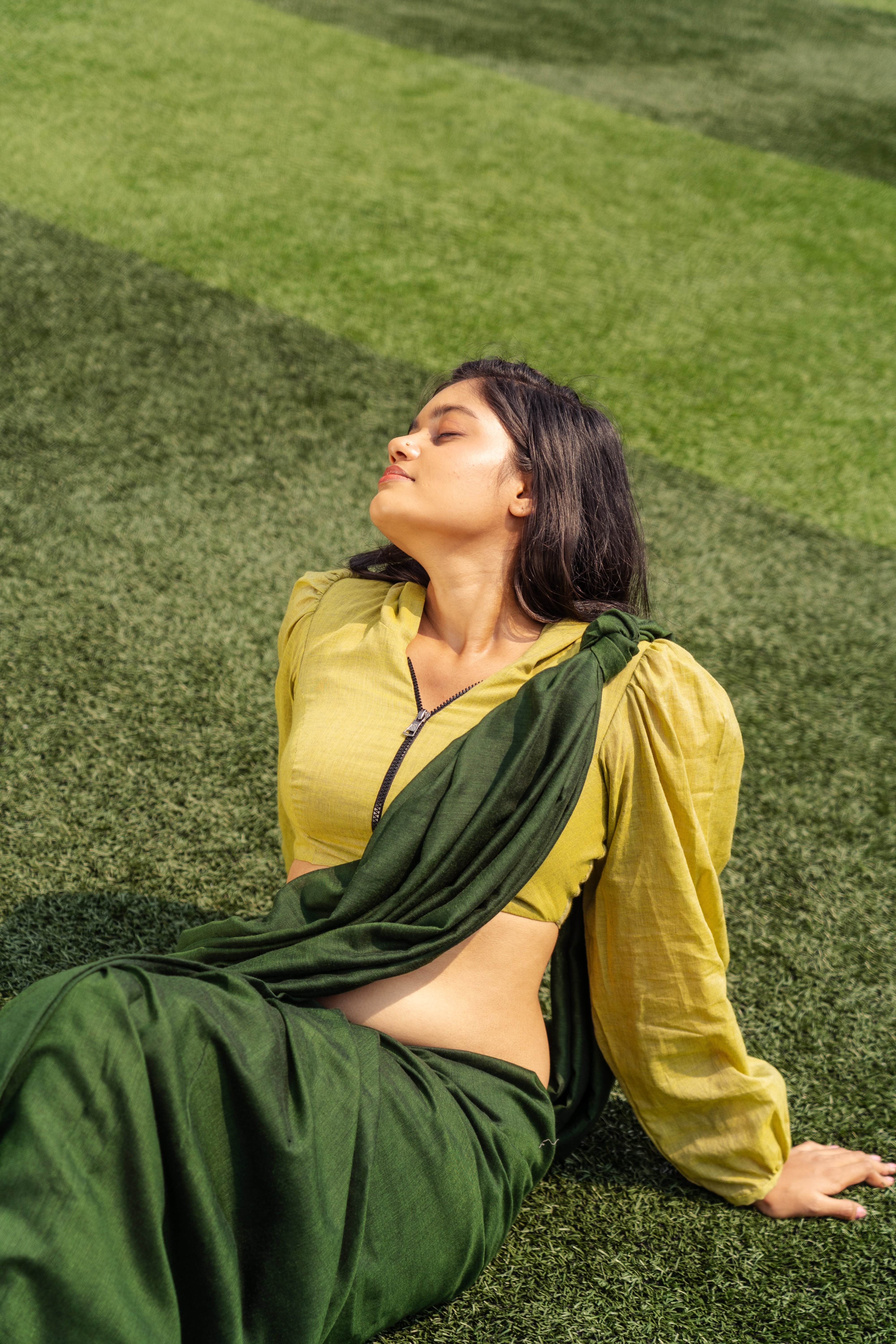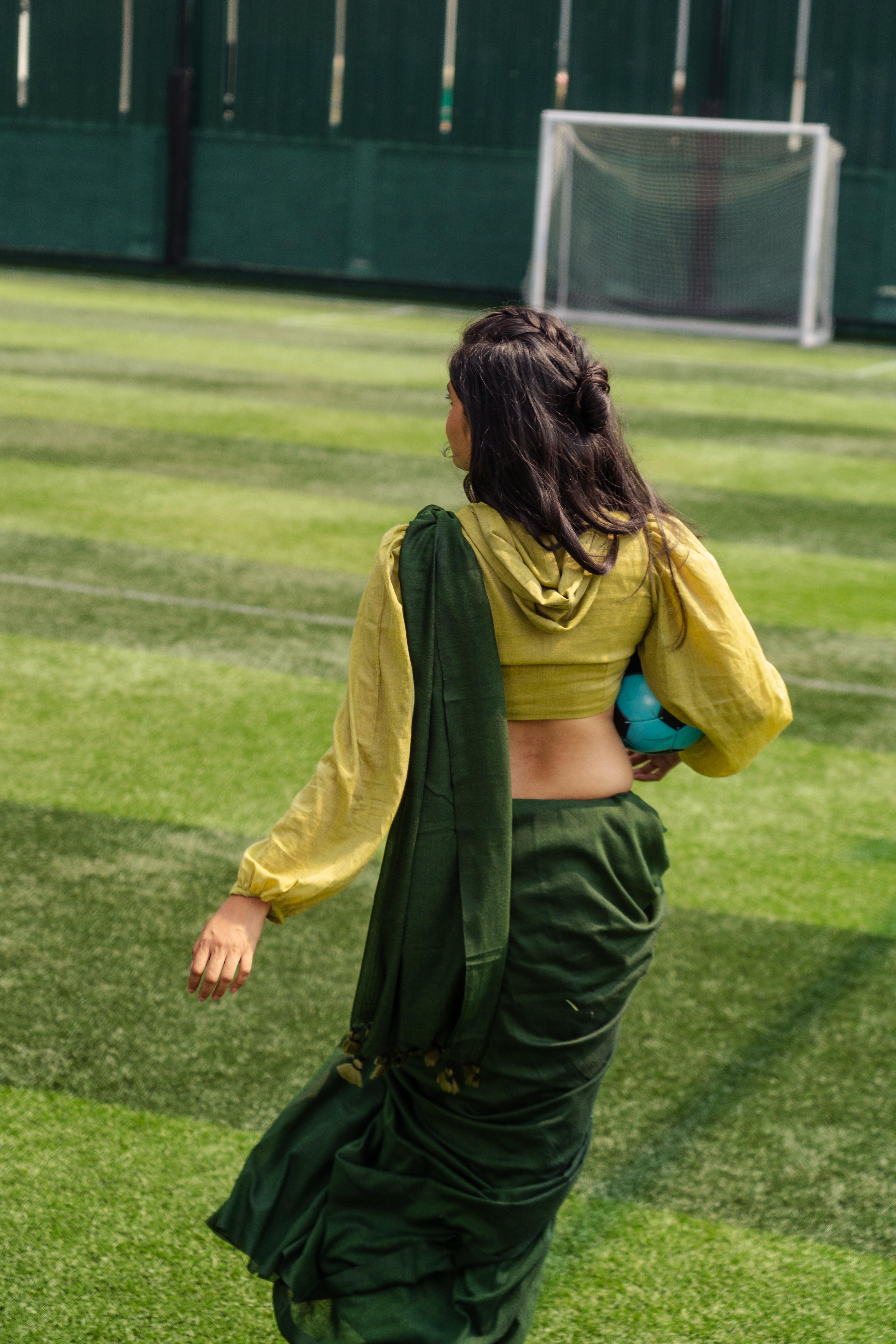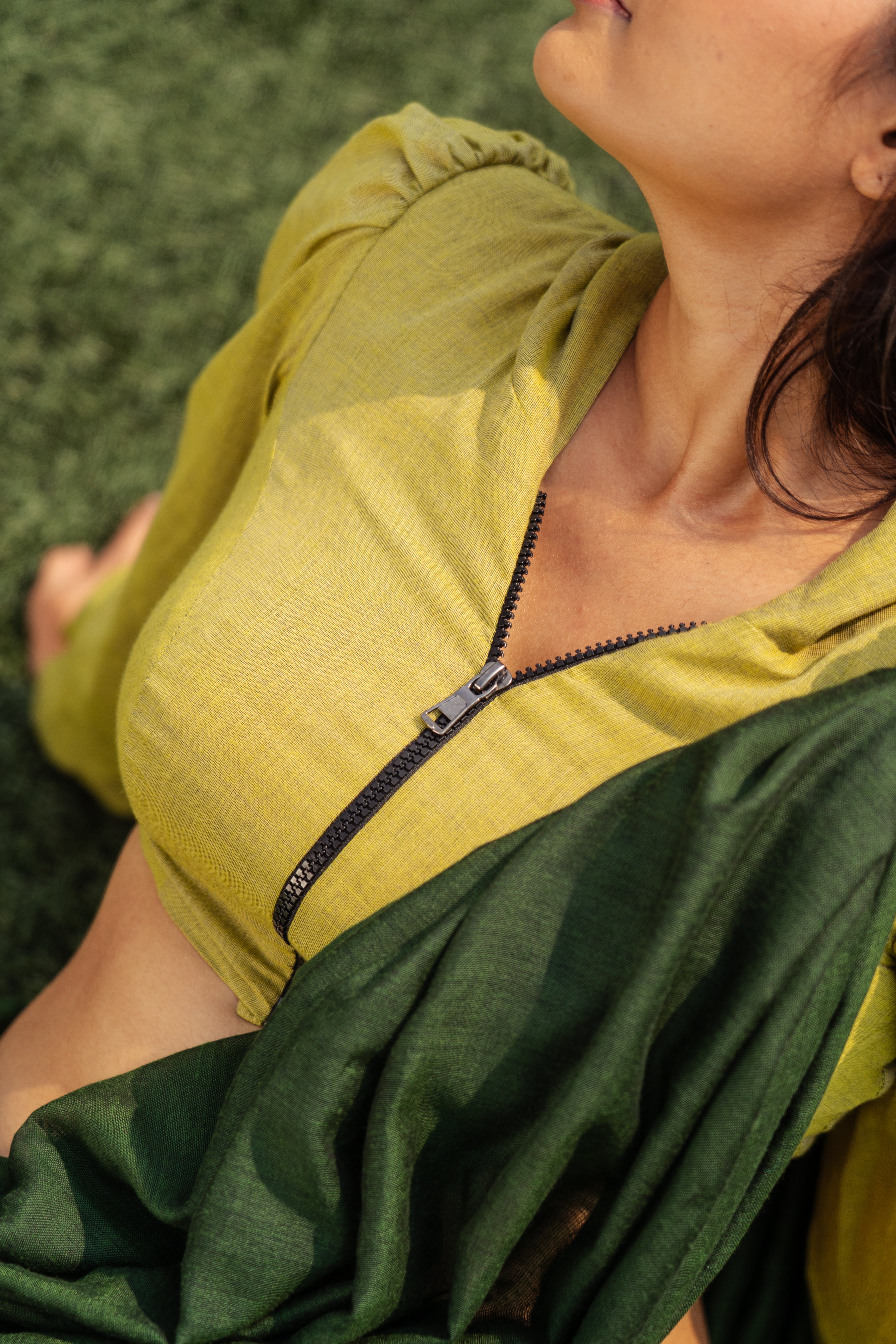 A feather lite pure soft cotton puffed full sleeves hoodie, lined with the same fabric to get the exact soft feel of the fabric on your body in Savannah Green colour with a black zipper and a hoodie back blouse, perfect, versatile, chic and bold on a saree or a skirt or your shorts or jeans or your joggers. The fabric is constructed thoughtfully to beat the heat of this summer and yet stylish enough to pair them quirkily with the anything that your heart desires.