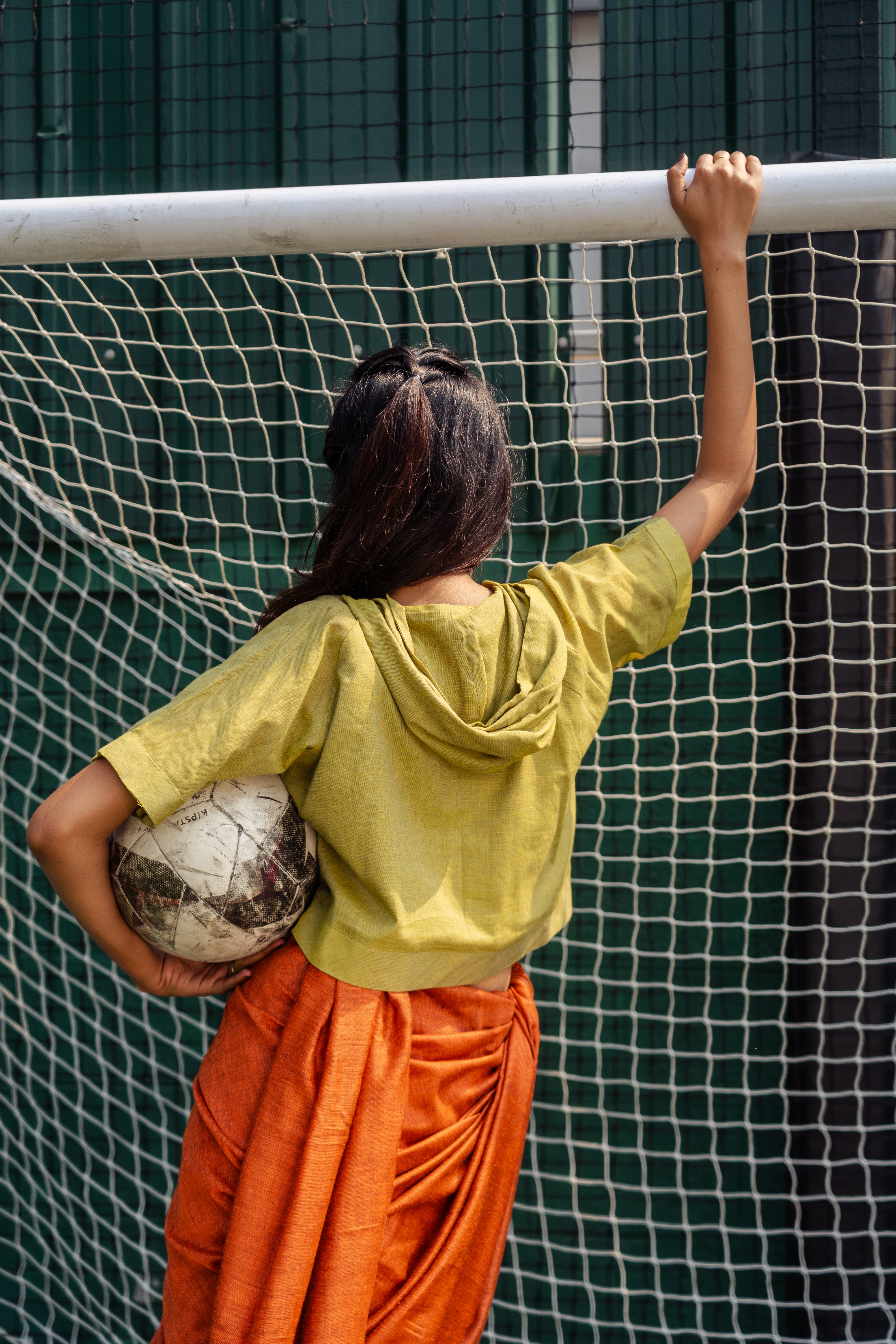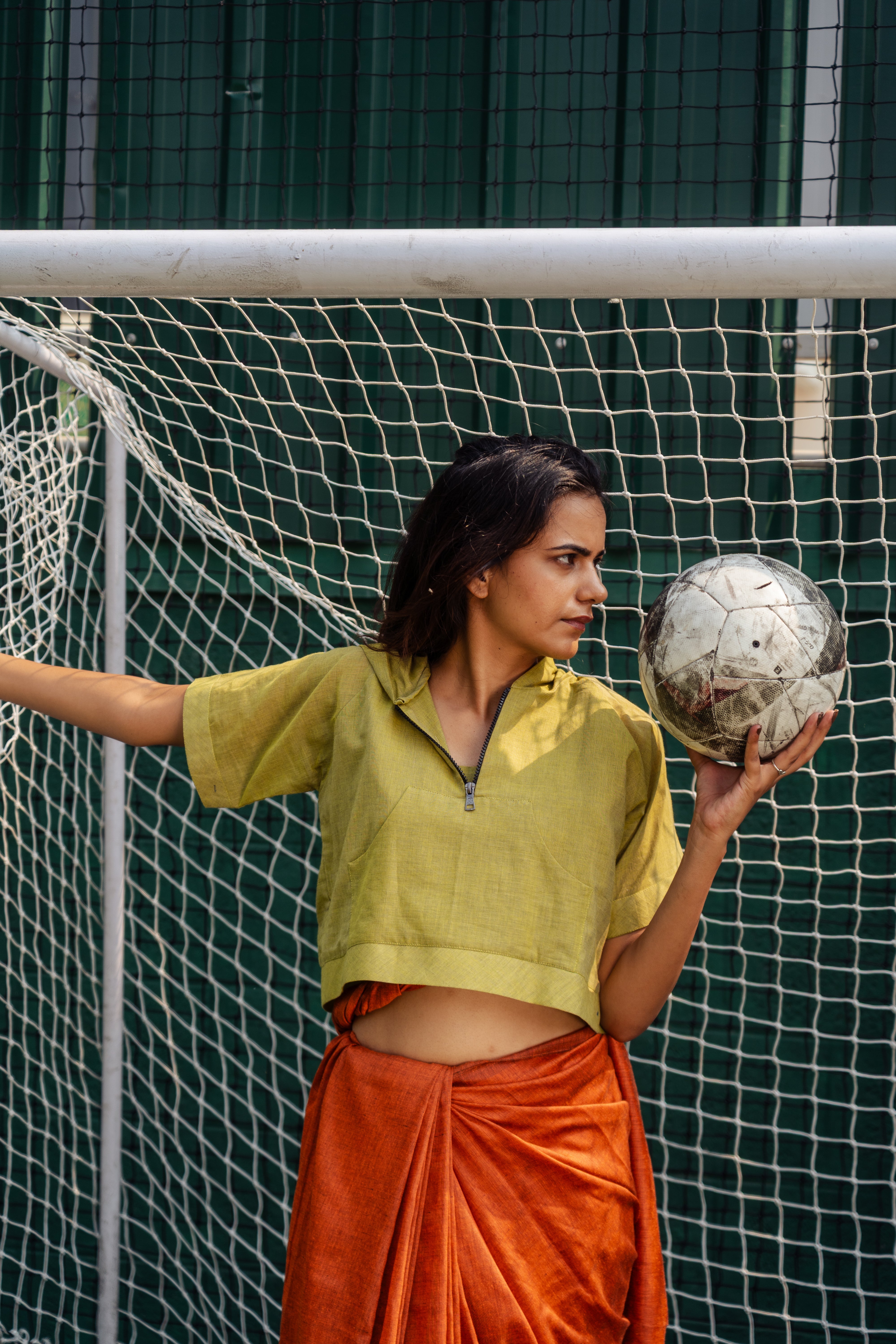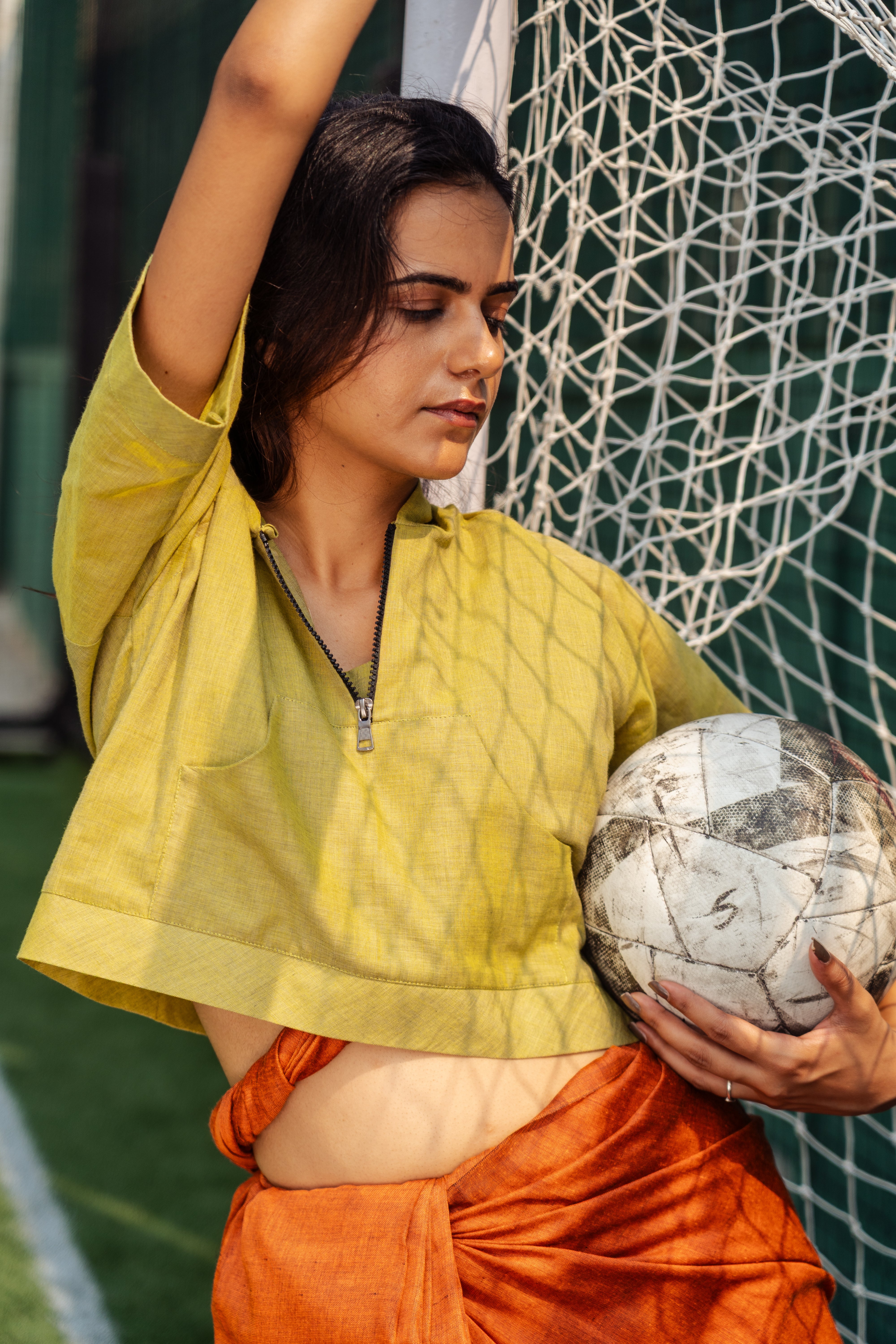 A feather lite pure soft cotton half sleeves with pocket hoodie, lined with the same fabric to get the exact soft feel of the fabric on your body in Savannah Green colour with a black zipper and a hoodie back blouse, perfect, versatile, chic and bold on a saree or a skirt or your shorts or jeans or your joggers. The fabric is constructed thoughtfully to beat the heat of this summer and yet stylish enough to pair them quirkily with the anything that your heart desires.