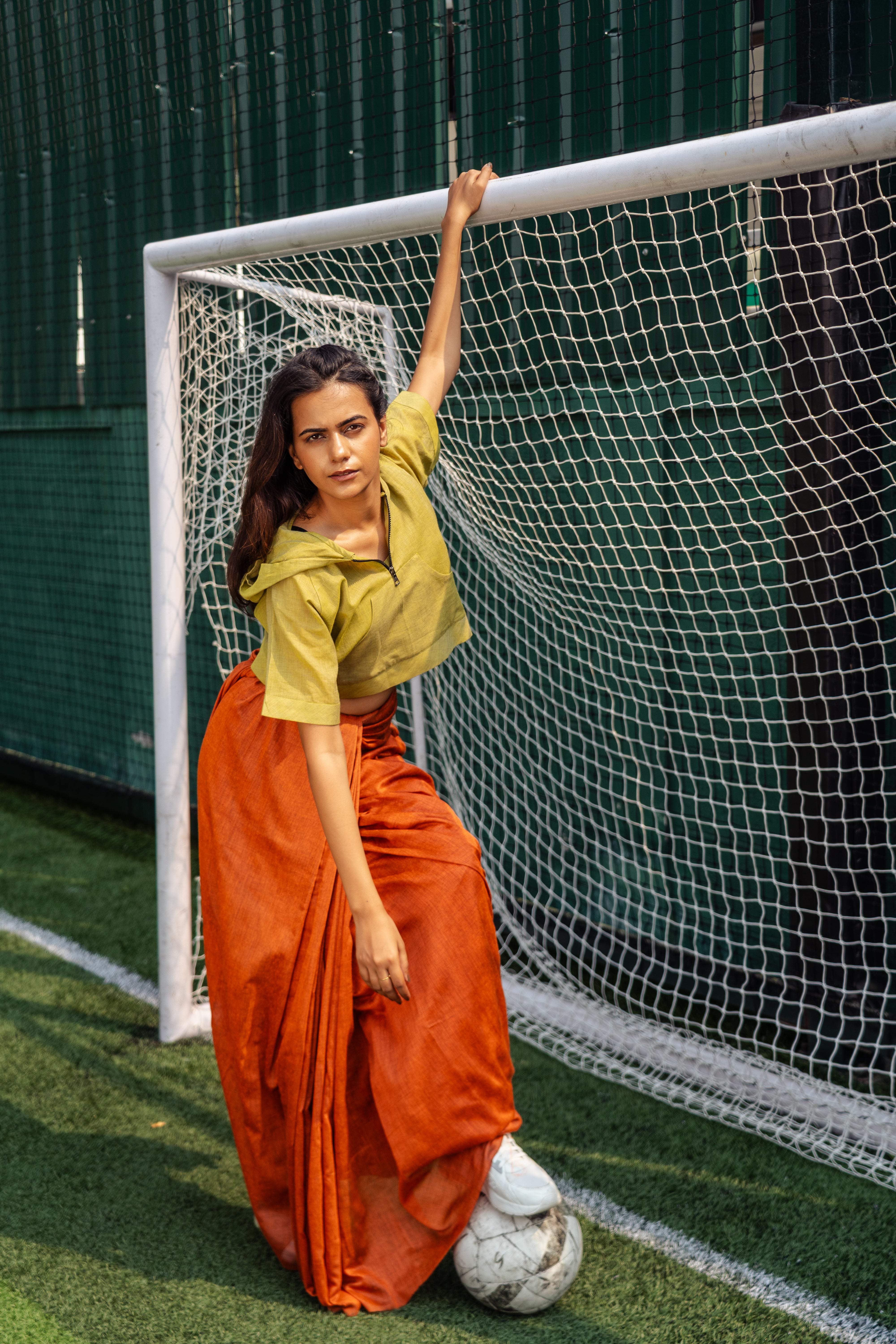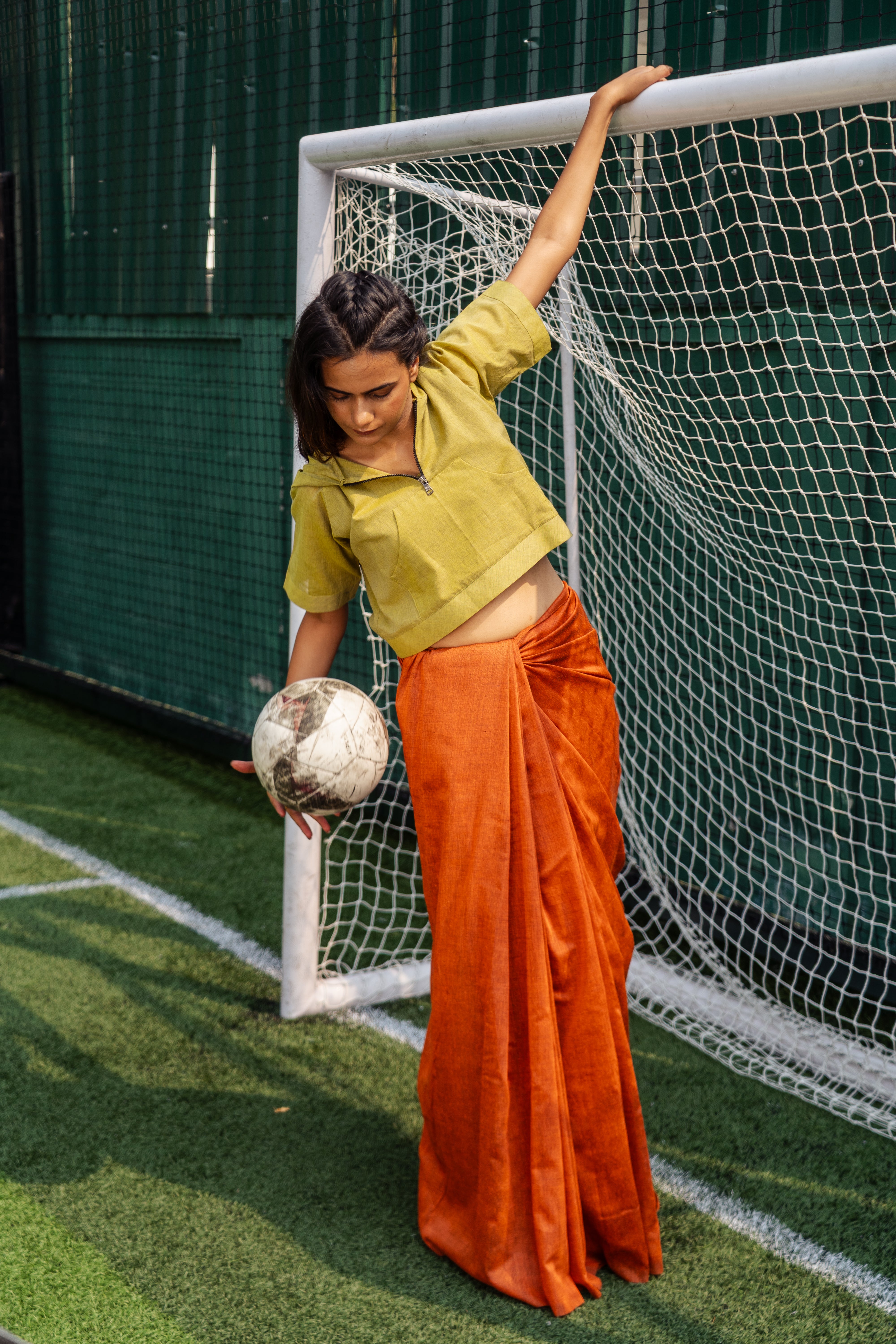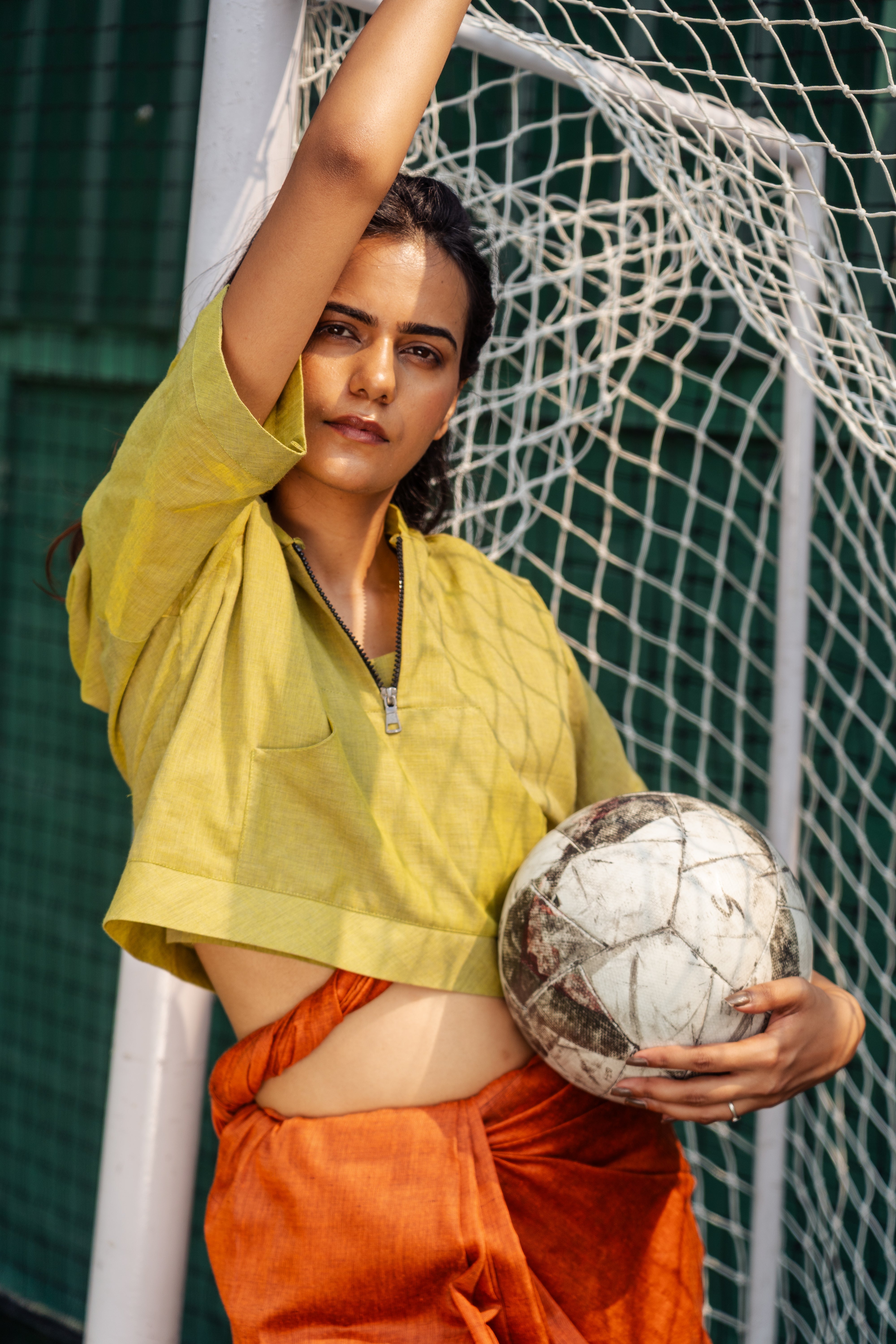 A feather lite pure soft cotton half sleeves with pocket hoodie, lined with the same fabric to get the exact soft feel of the fabric on your body in Savannah Green colour with a black zipper and a hoodie back blouse, perfect, versatile, chic and bold on a saree or a skirt or your shorts or jeans or your joggers. The fabric is constructed thoughtfully to beat the heat of this summer and yet stylish enough to pair them quirkily with the anything that your heart desires.