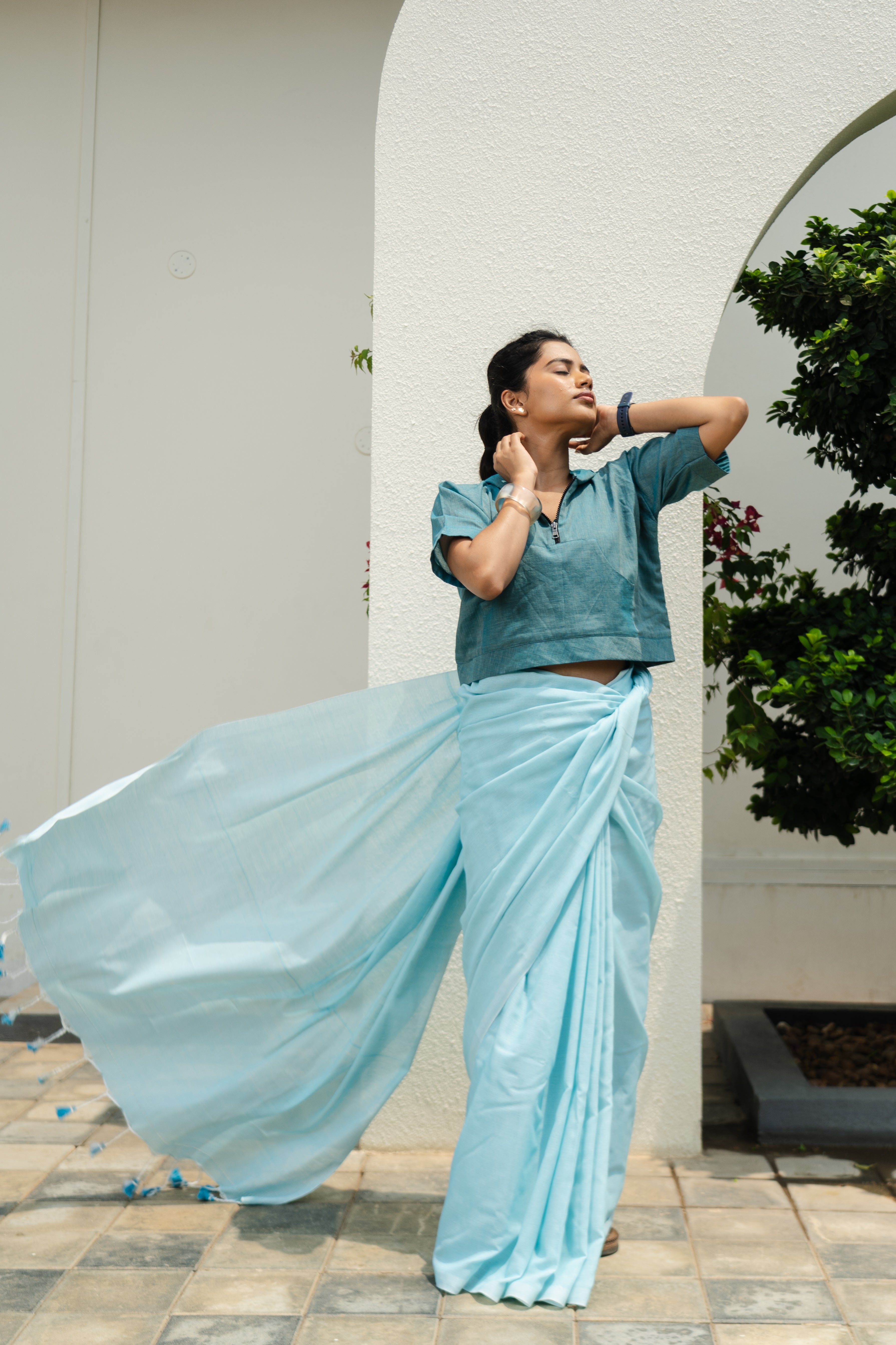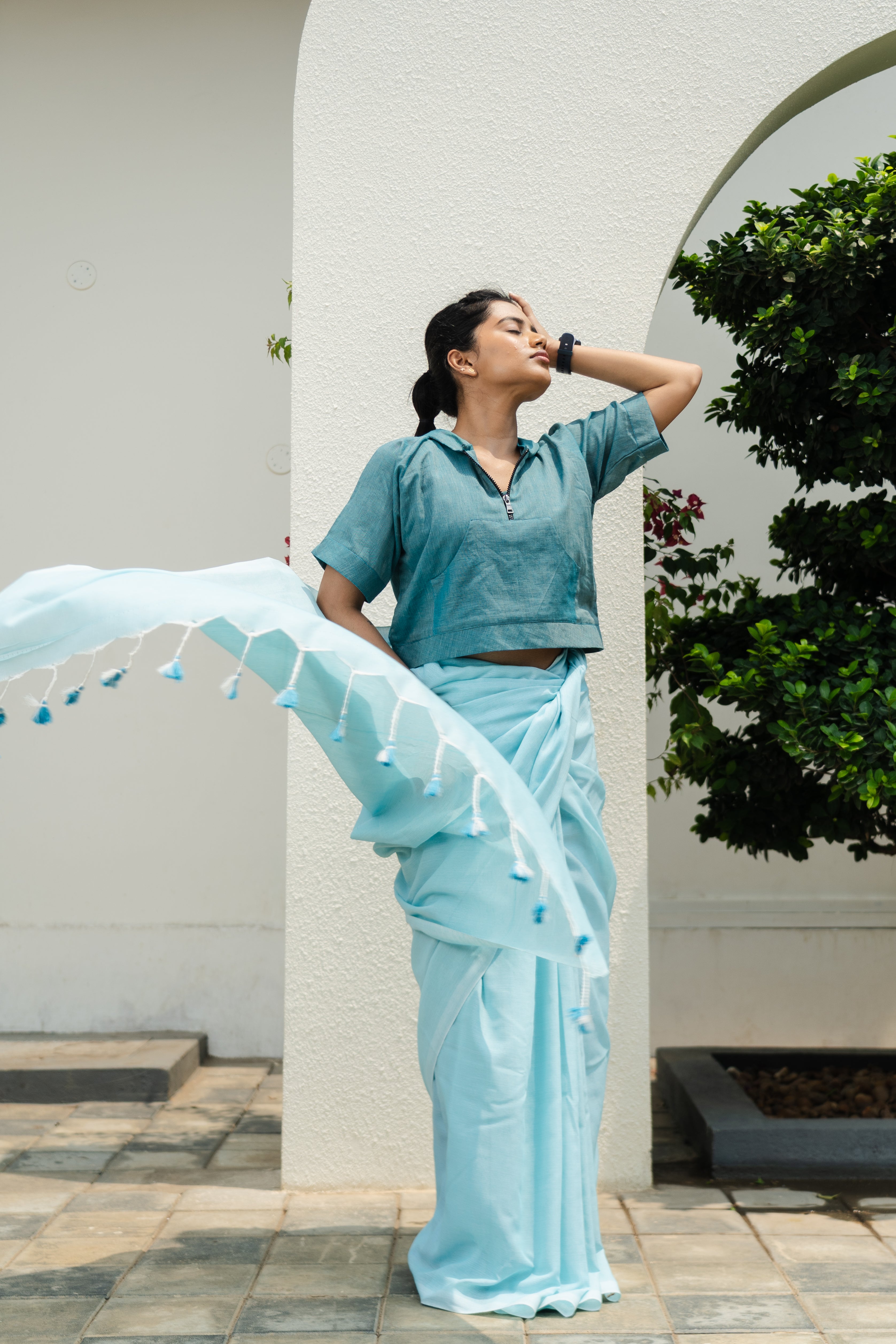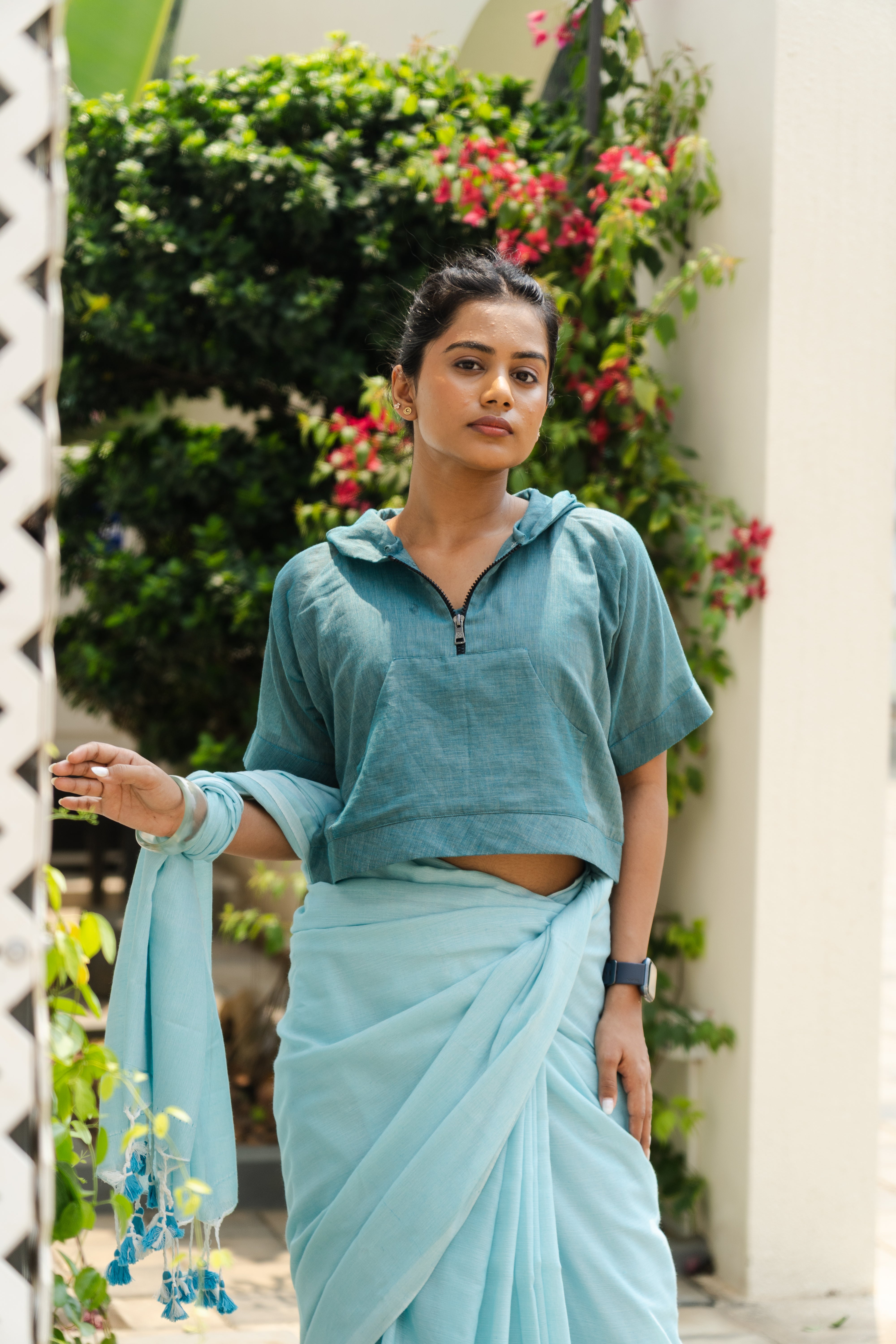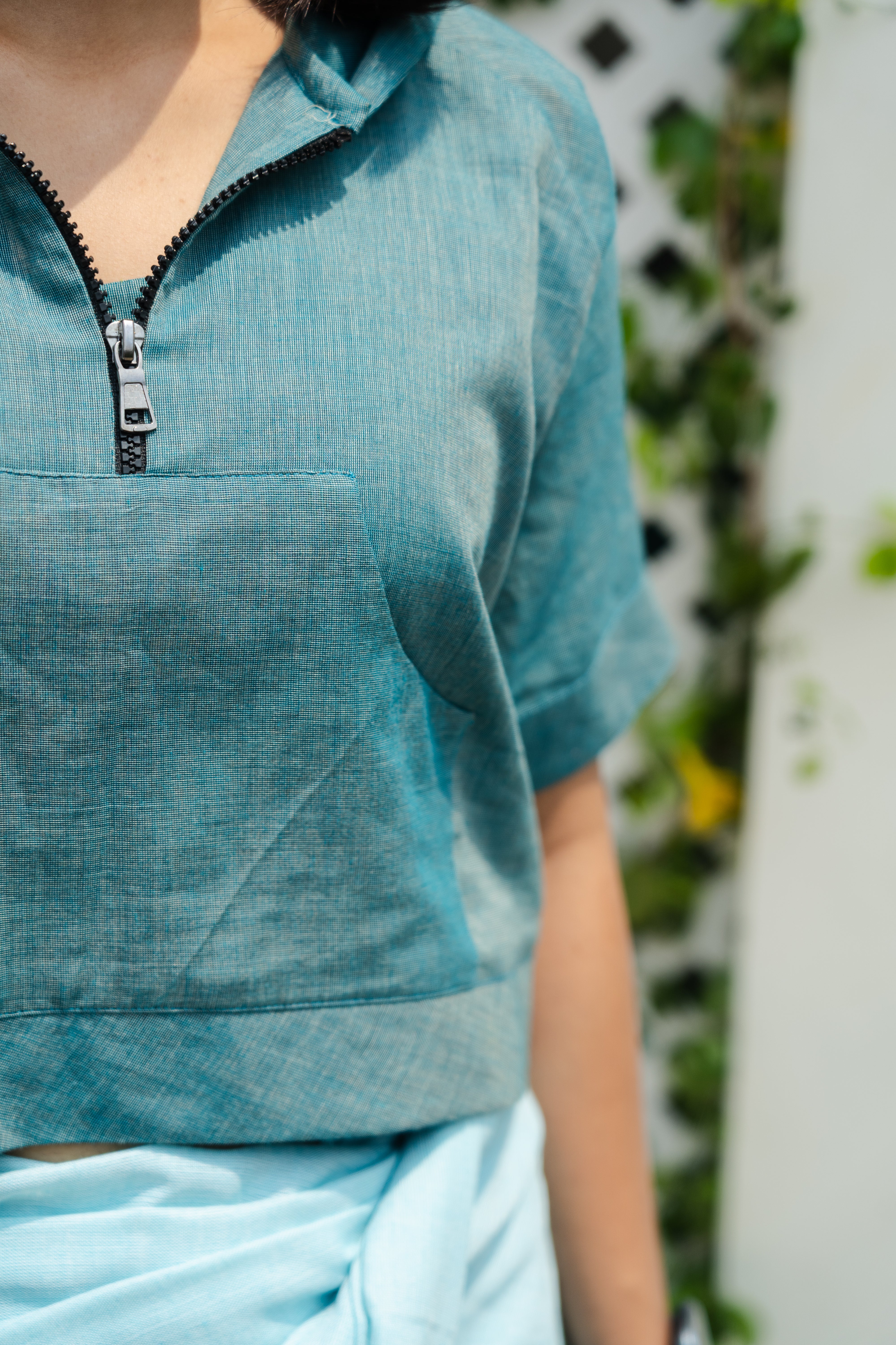 A feather lite pure soft cotton half sleeves with pocket hoodie, lined with the same fabric to get the exact soft feel of the fabric on your body in Teal Ocean colour with a black zipper and a hoodie back blouse, perfect, versatile, chic and bold on a saree or a skirt or your shorts or jeans or your joggers. The fabric is constructed thoughtfully to beat the heat of this summer and yet stylish enough to pair them quirkily with the anything that your heart desires.