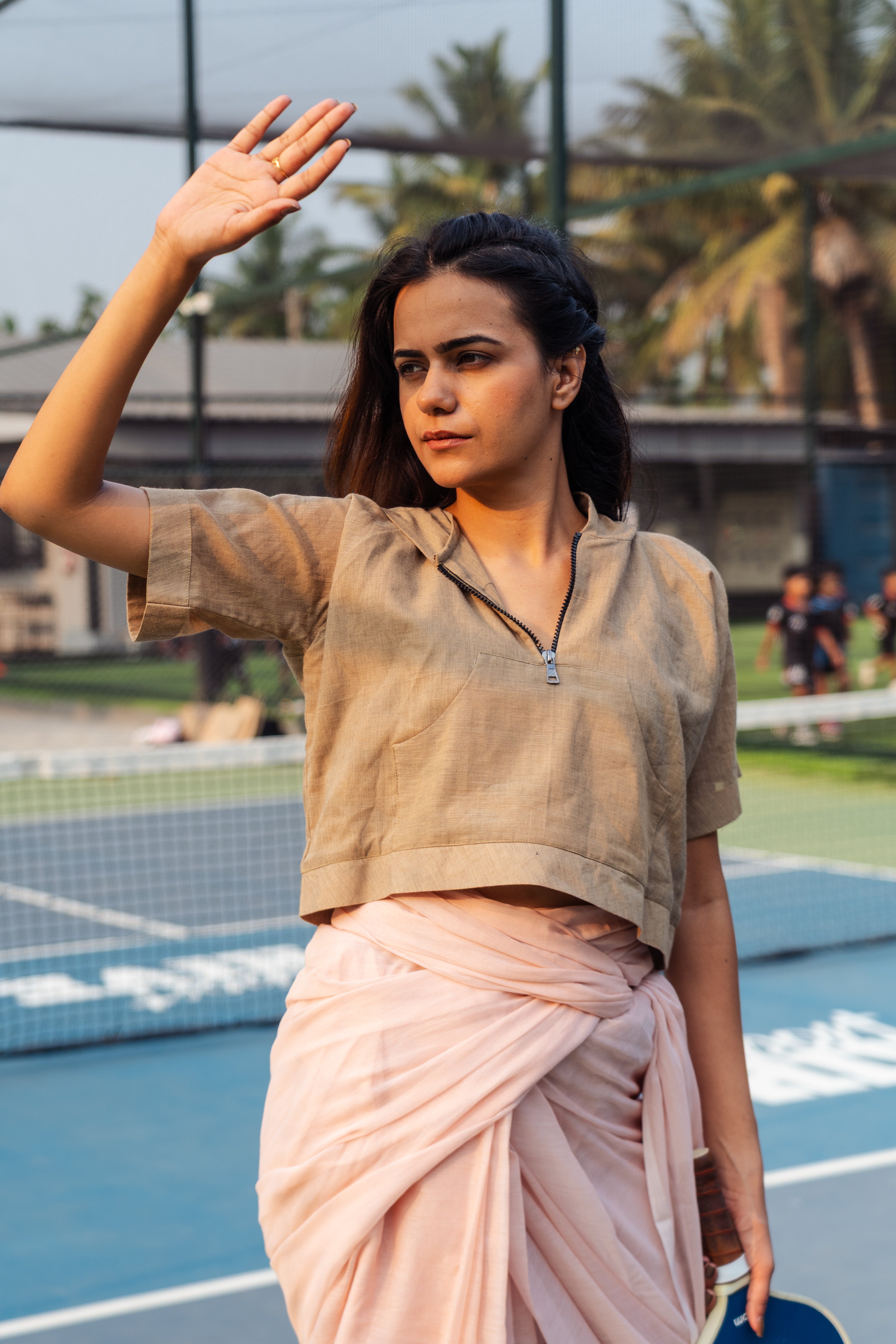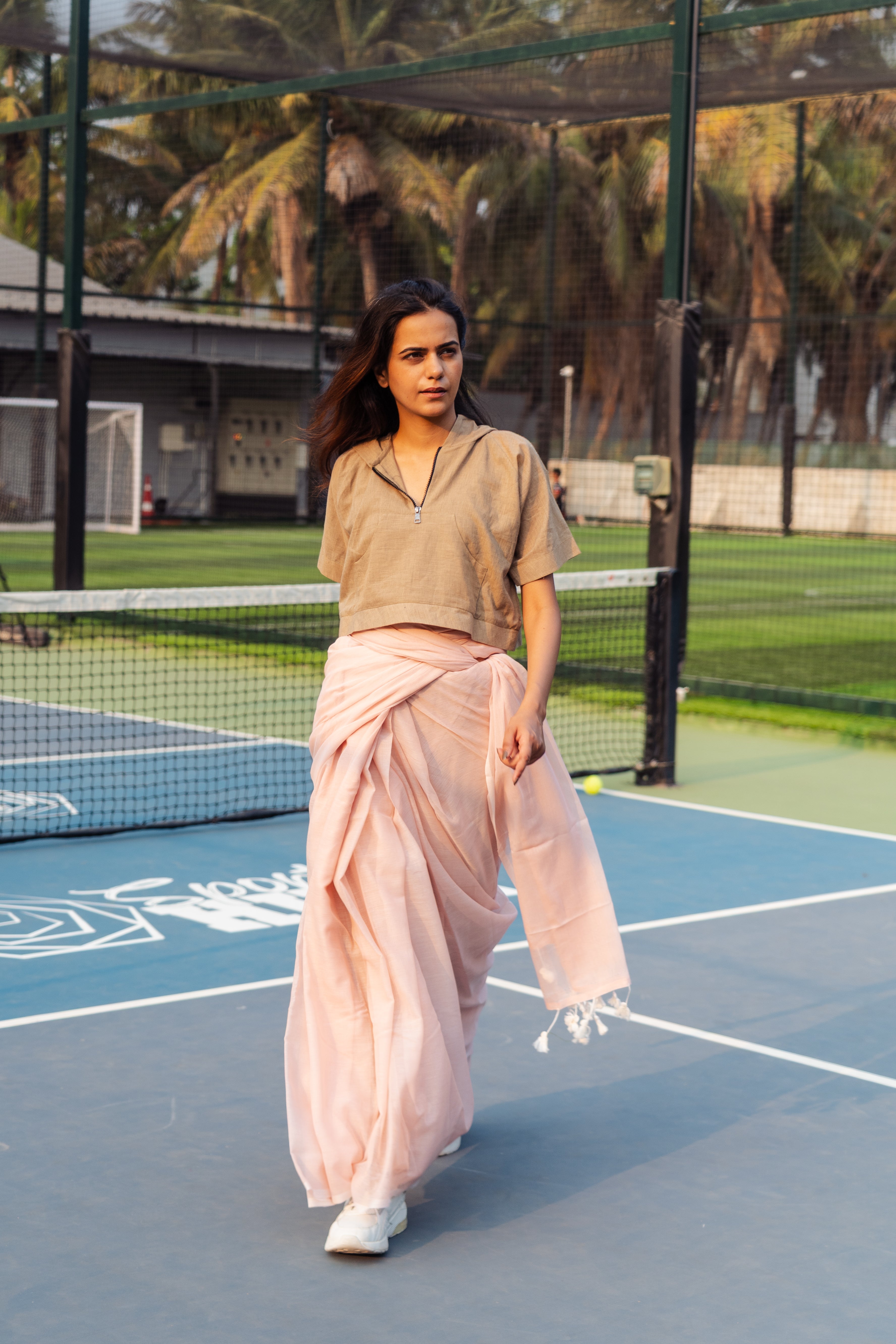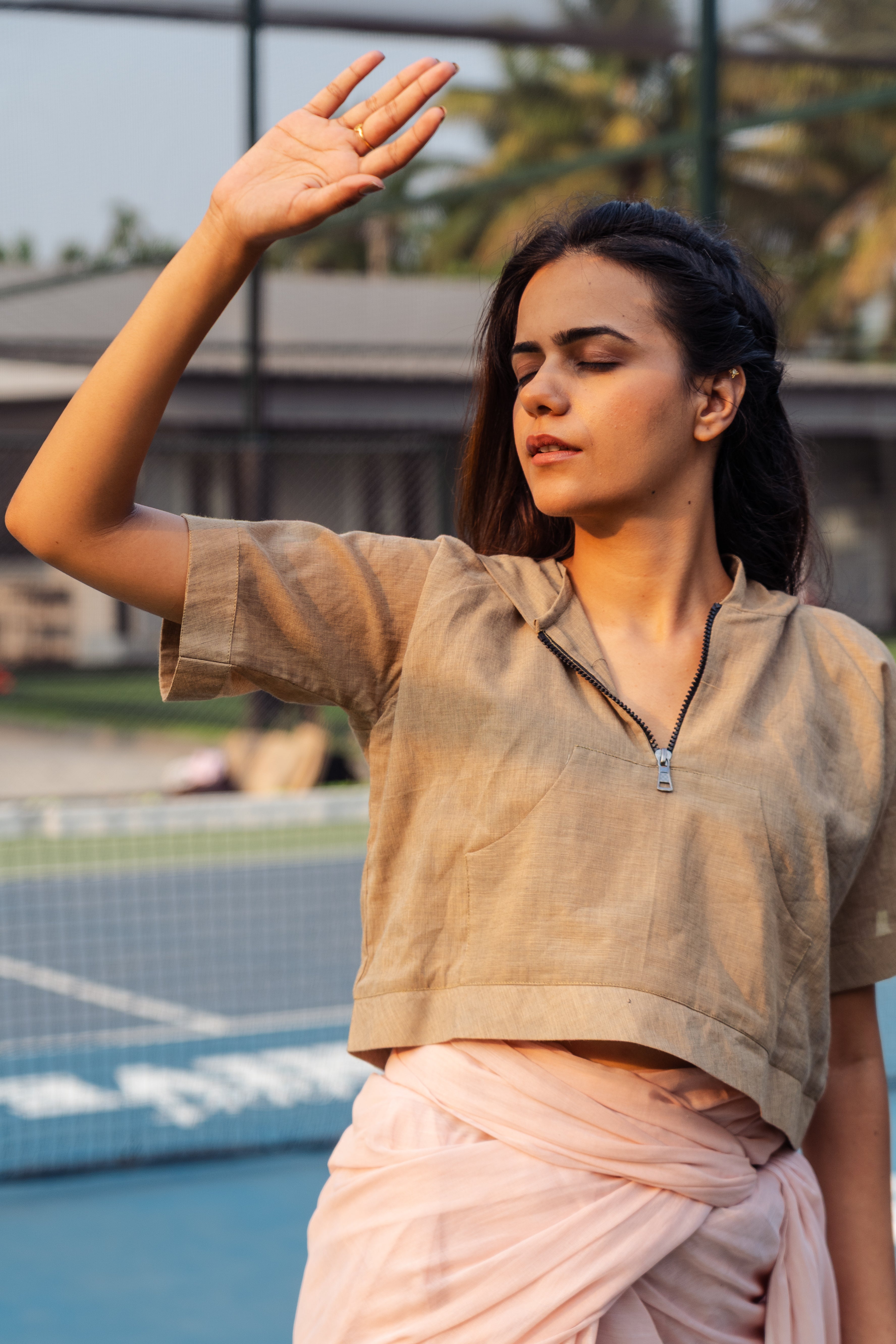 A feather lite pure soft cotton half sleeves with pocket hoodie, lined with the same fabric to get the exact soft feel of the fabric on your body in Warm Oak colour with a black zipper and a hoodie back blouse, perfect, versatile, chic and bold on a saree or a skirt or your shorts or jeans or your joggers. The fabric is constructed thoughtfully to beat the heat of this summer and yet stylish enough to pair them quirkily with the anything that your heart desires.
